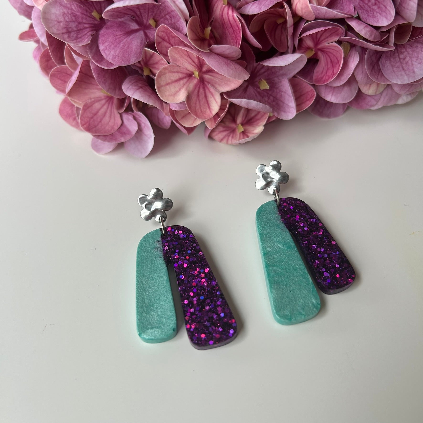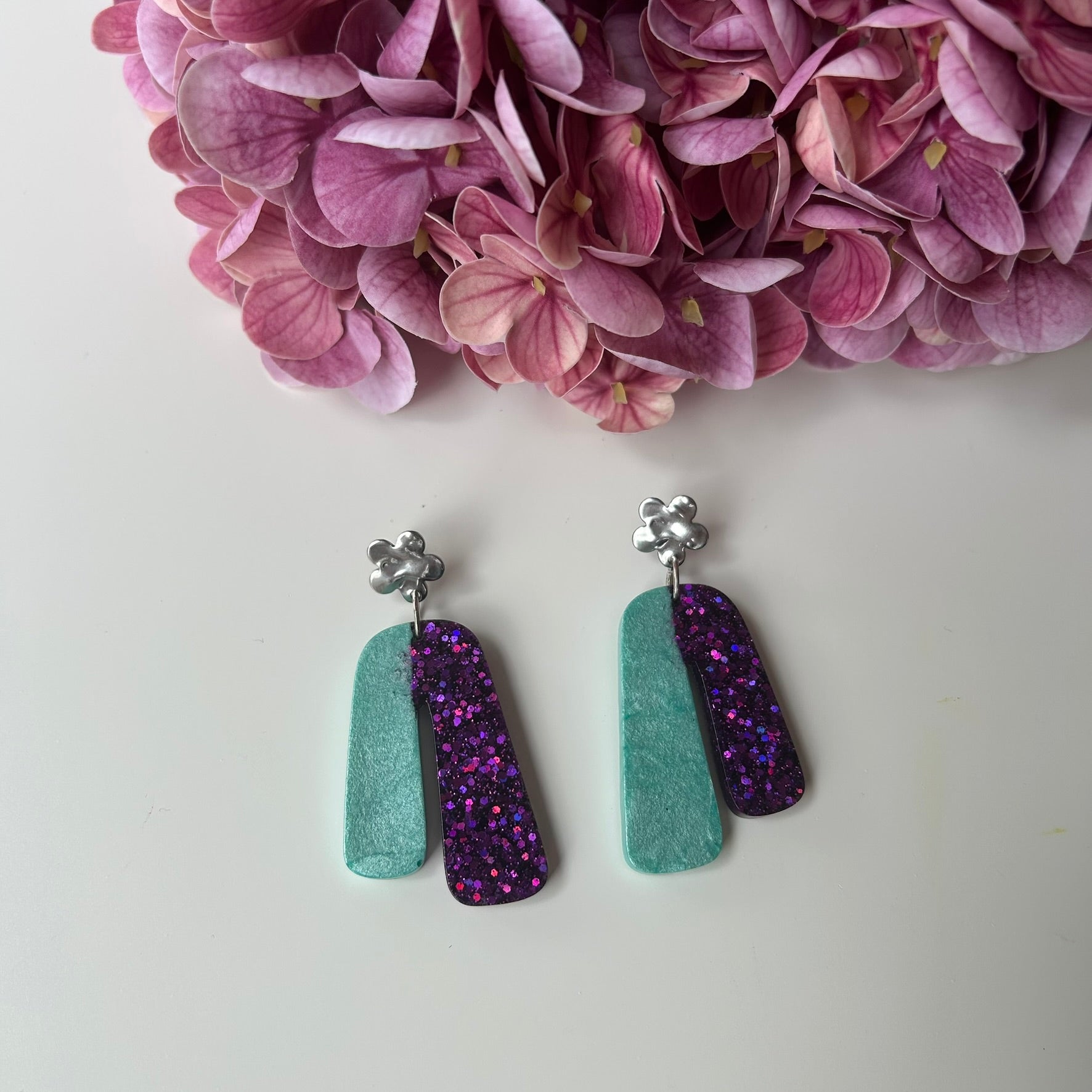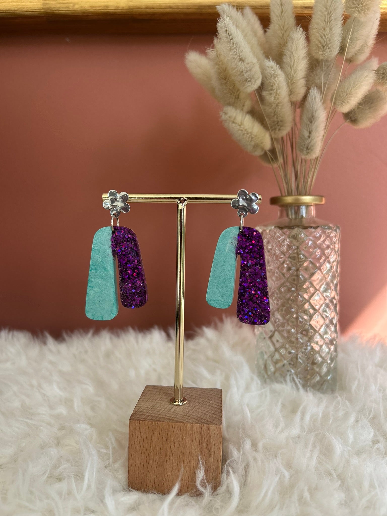 💜💚 Éclatantes et modernes, ces boucles associent une petite fleur argentée à deux formes allongées contrastées : l’une vert nacré, l’autre violette pailletée.