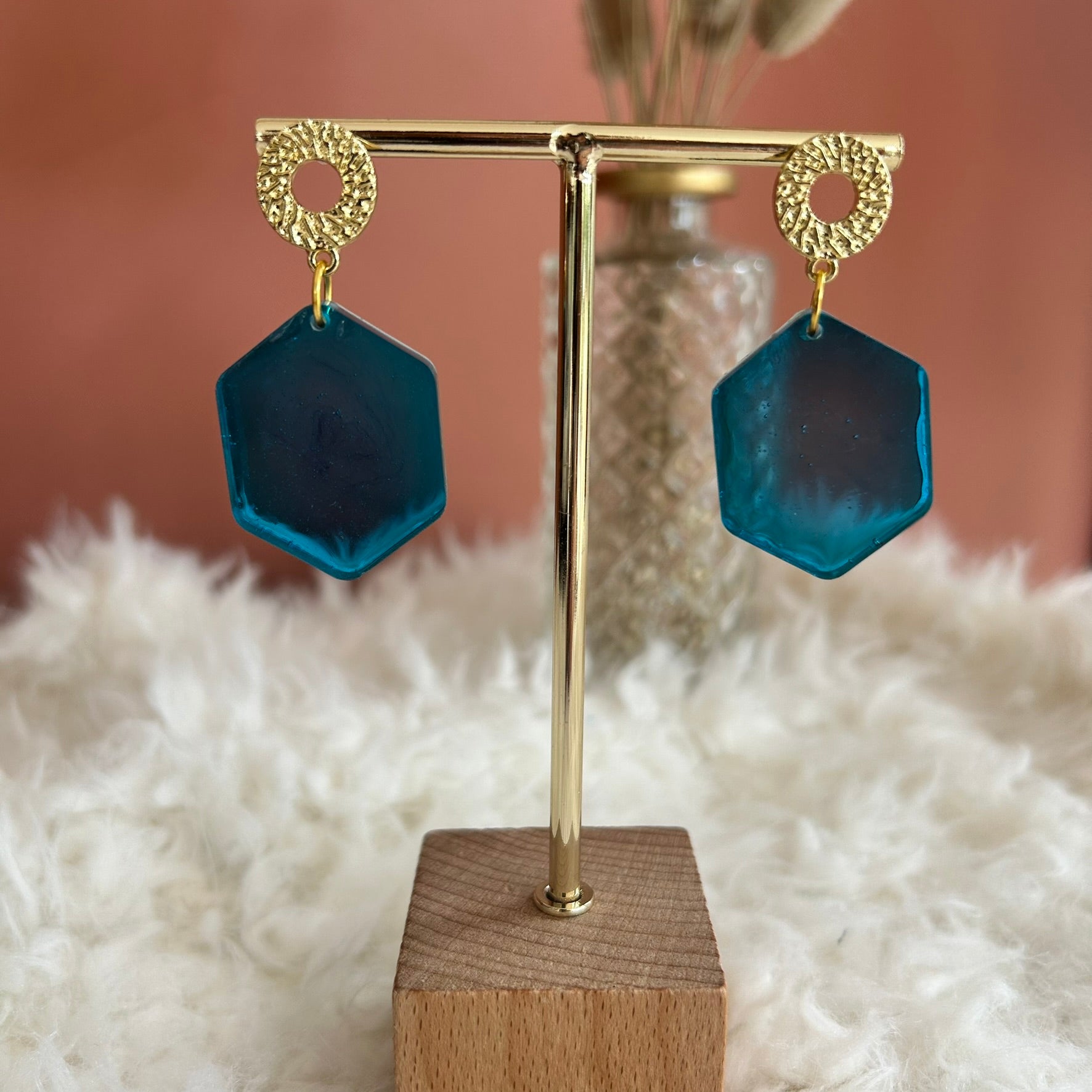 🔷 Les boucles Blao se distinguent par leur forme hexagonale élégante, suspendue à un petit anneau texturé. Un design à la fois géométrique et raffiné qui apporte une touche moderne et sophistiquée à vos tenues.