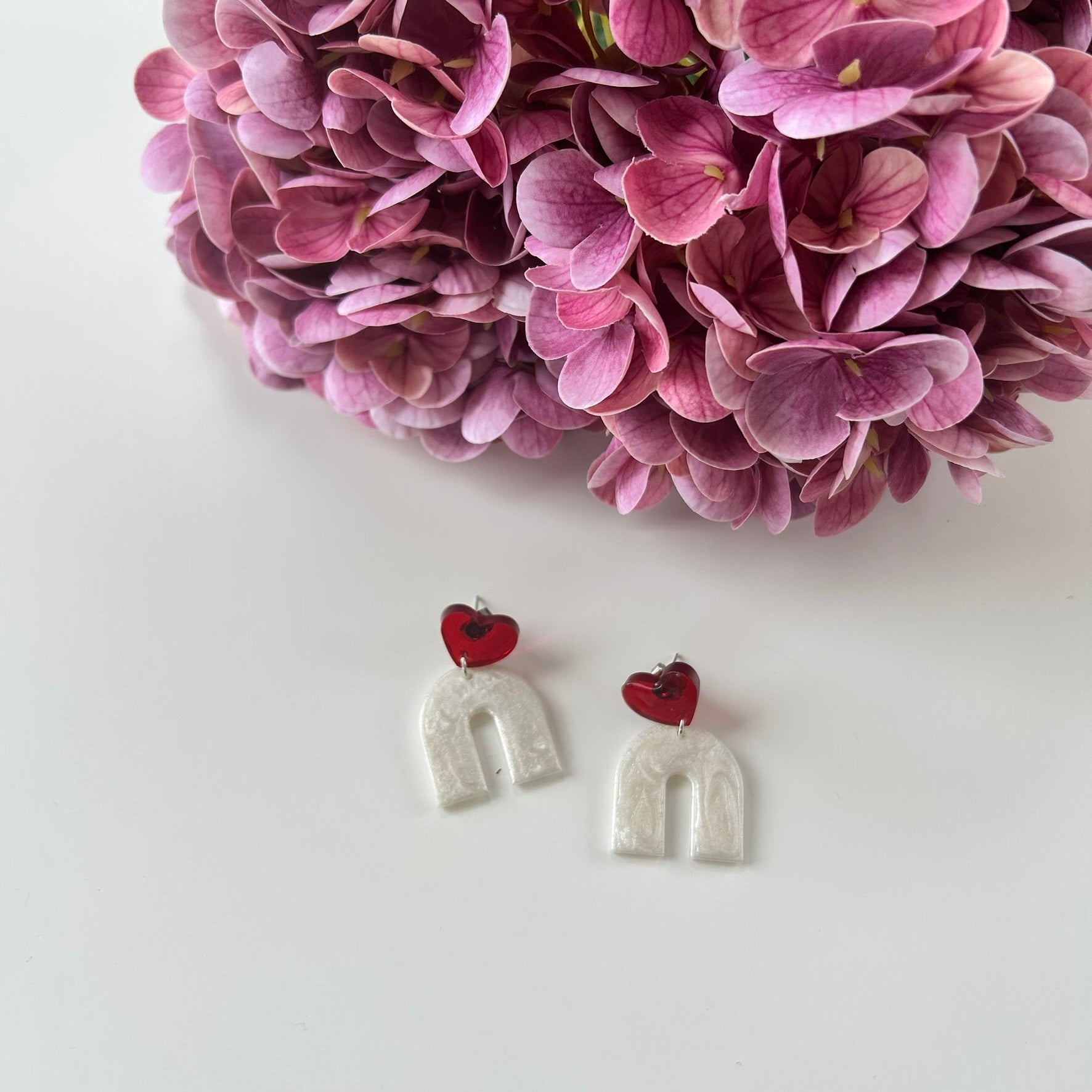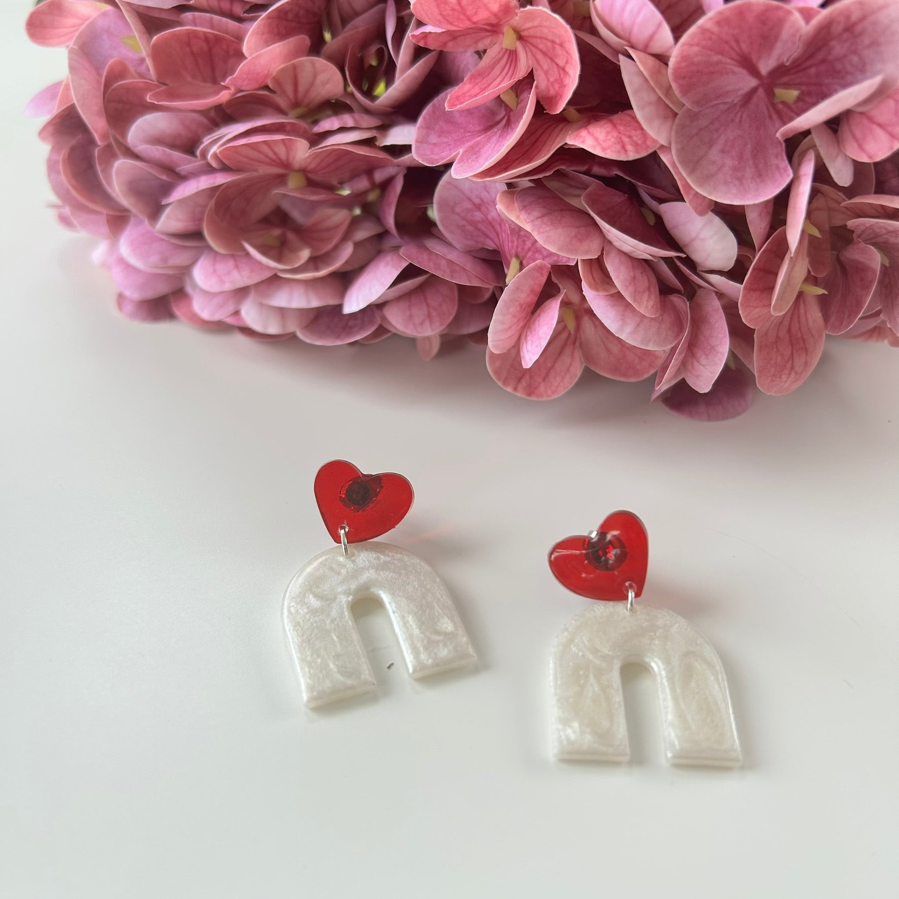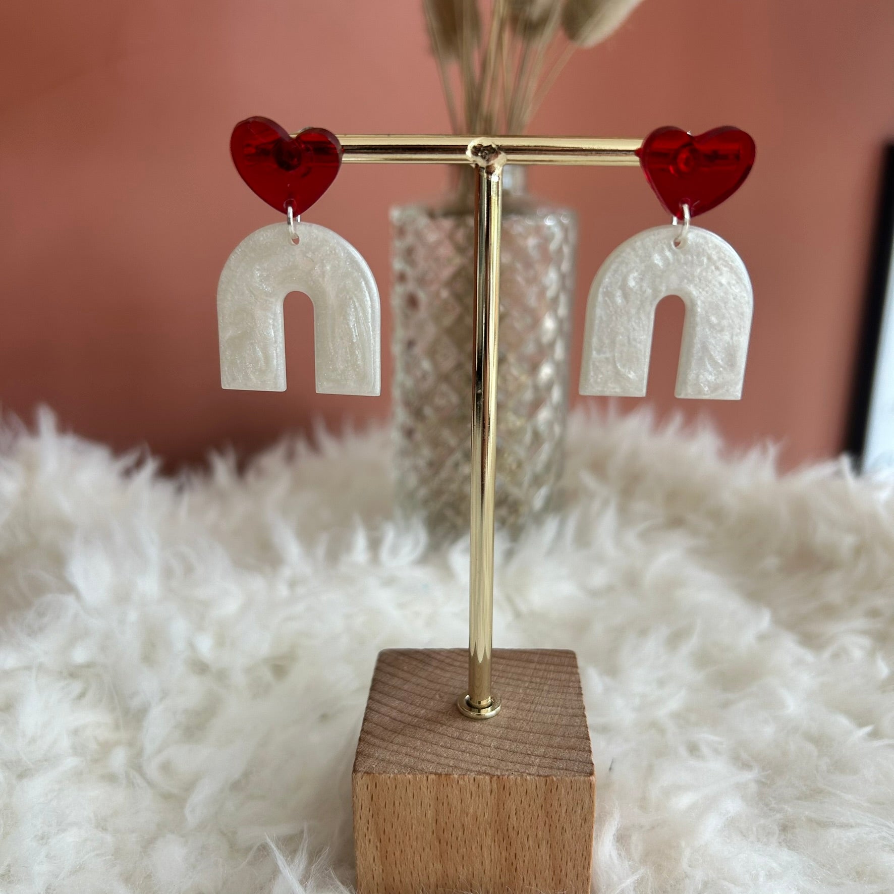 ❤️🌸Craquez pour cette paire pleine de douceur et de caractère : un cœur rouge éclatant en résine associé à une arche nacrée blanche aux reflets délicats.