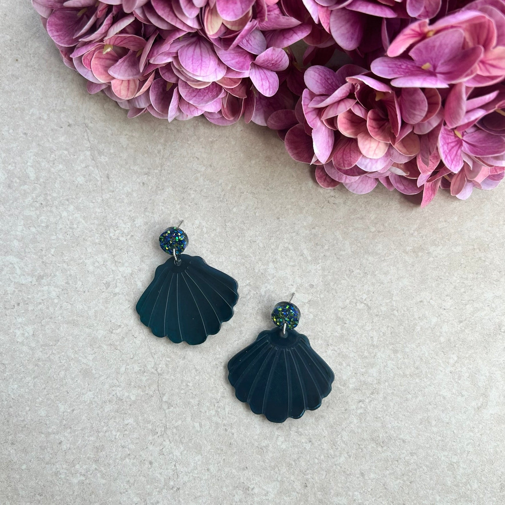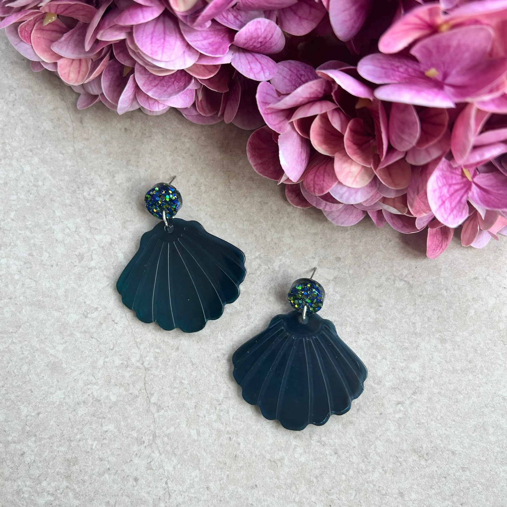 đ InspirĂ©es par l'ocĂ©an, ces boucles d'oreilles en forme de coquillage bleu foncĂ© apportent une touche chic et mystĂ©rieuse Ă vos tenues.