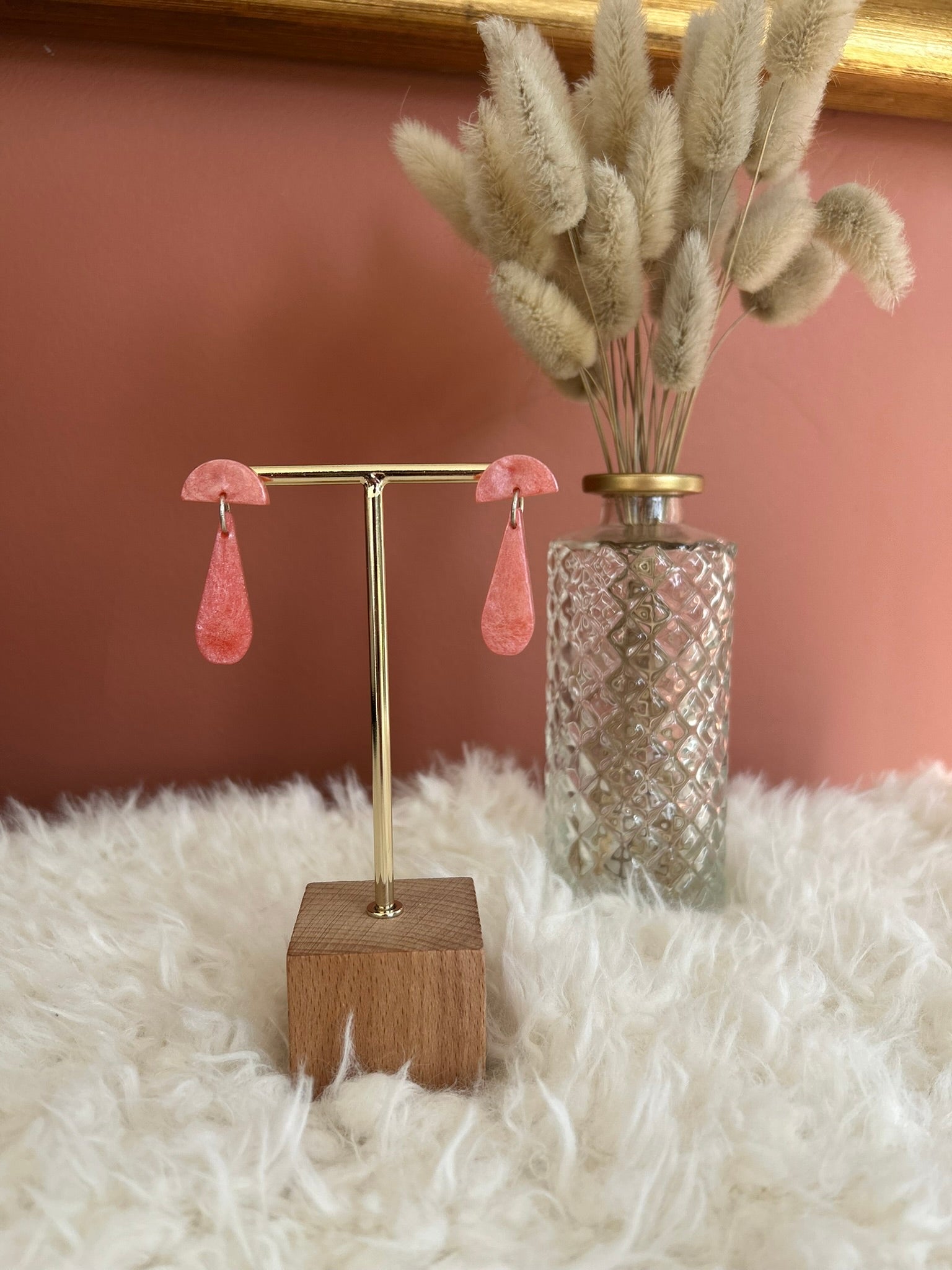 Chaque paire est fabriquée à la main et à la commande, en résine, garantissant un bijou unique, léger et confortable à porter.