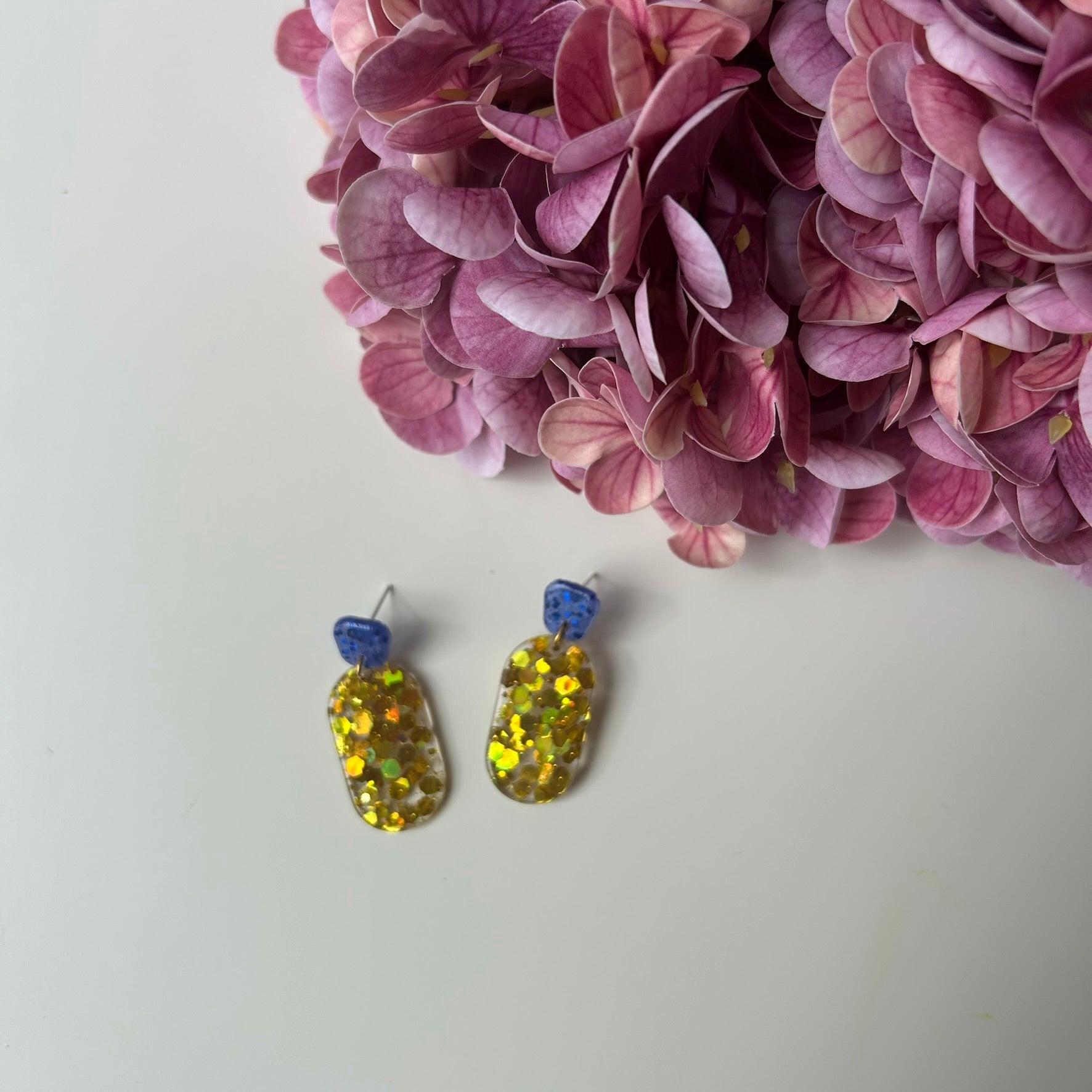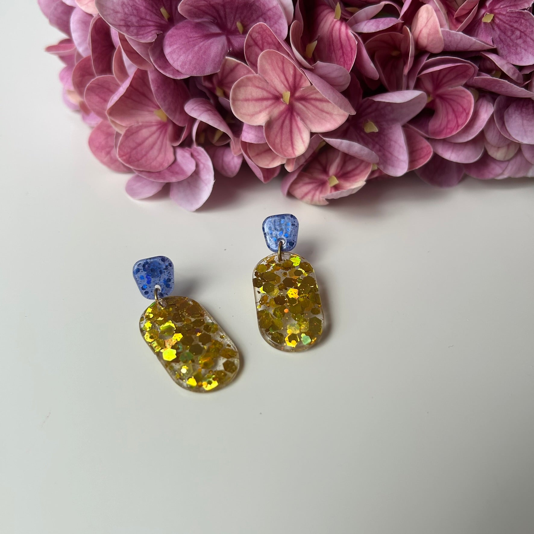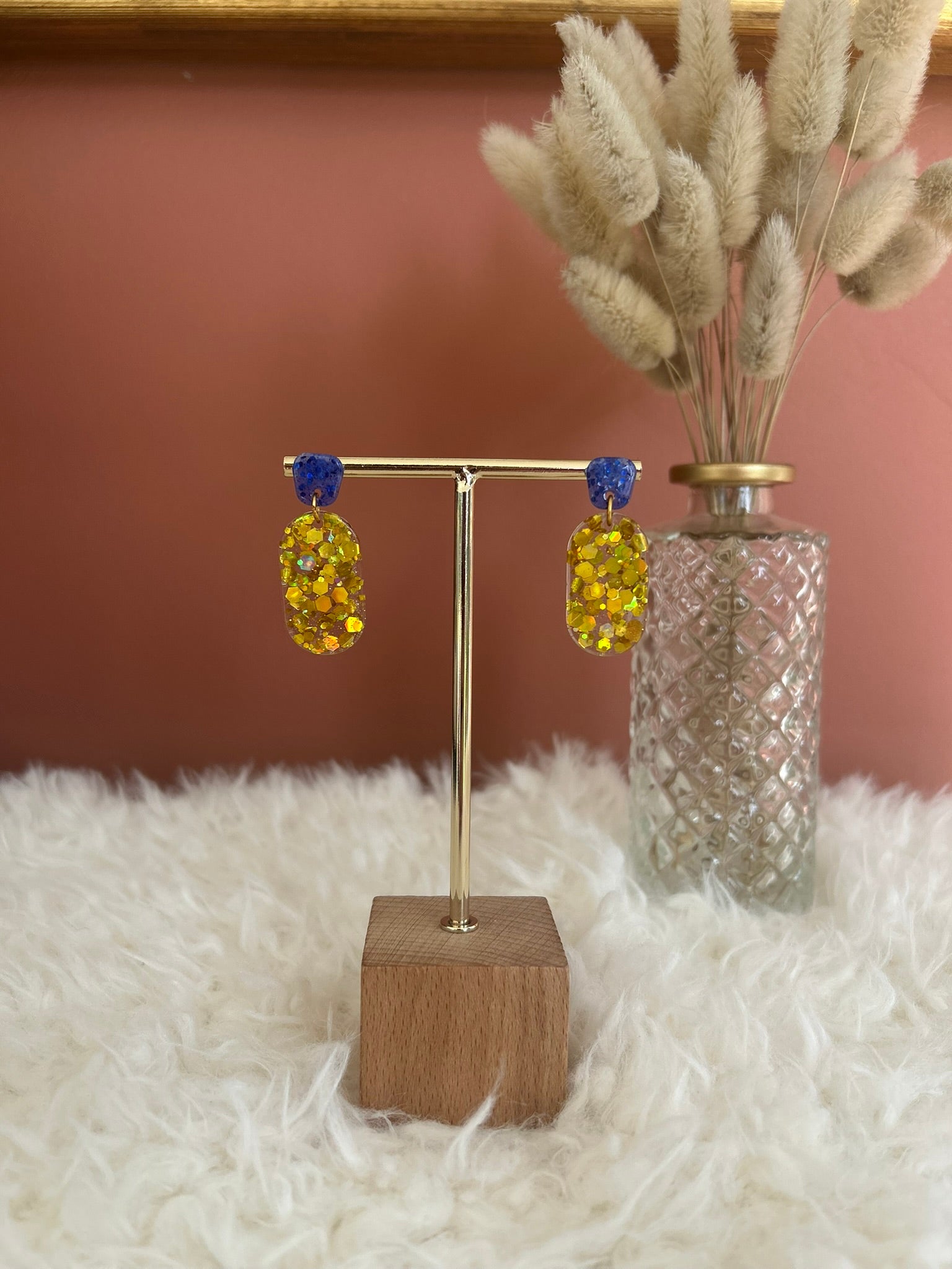 Ces boucles associent une pastille bleu intense à une pièce allongée jaune pailletée aux reflets holographiques.
