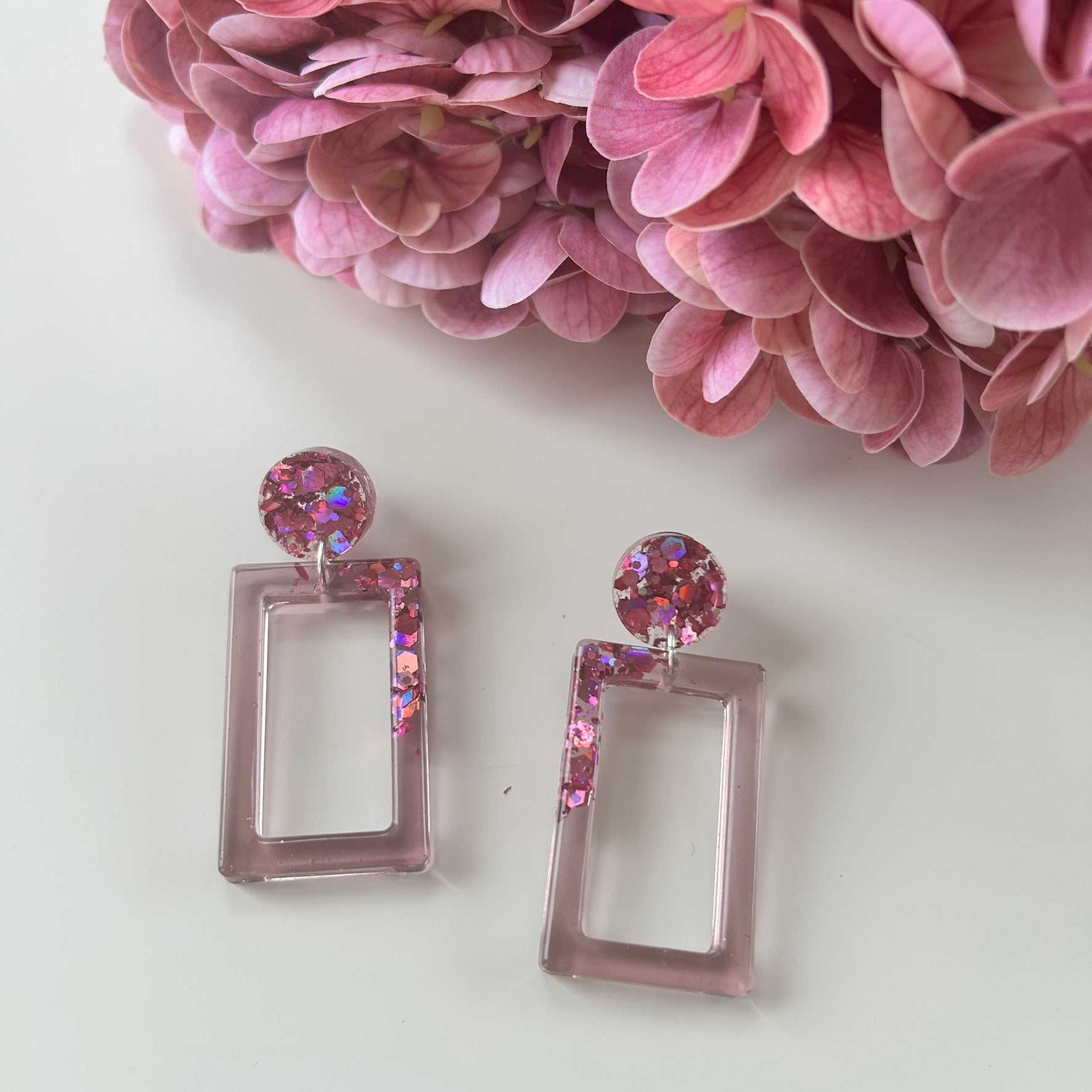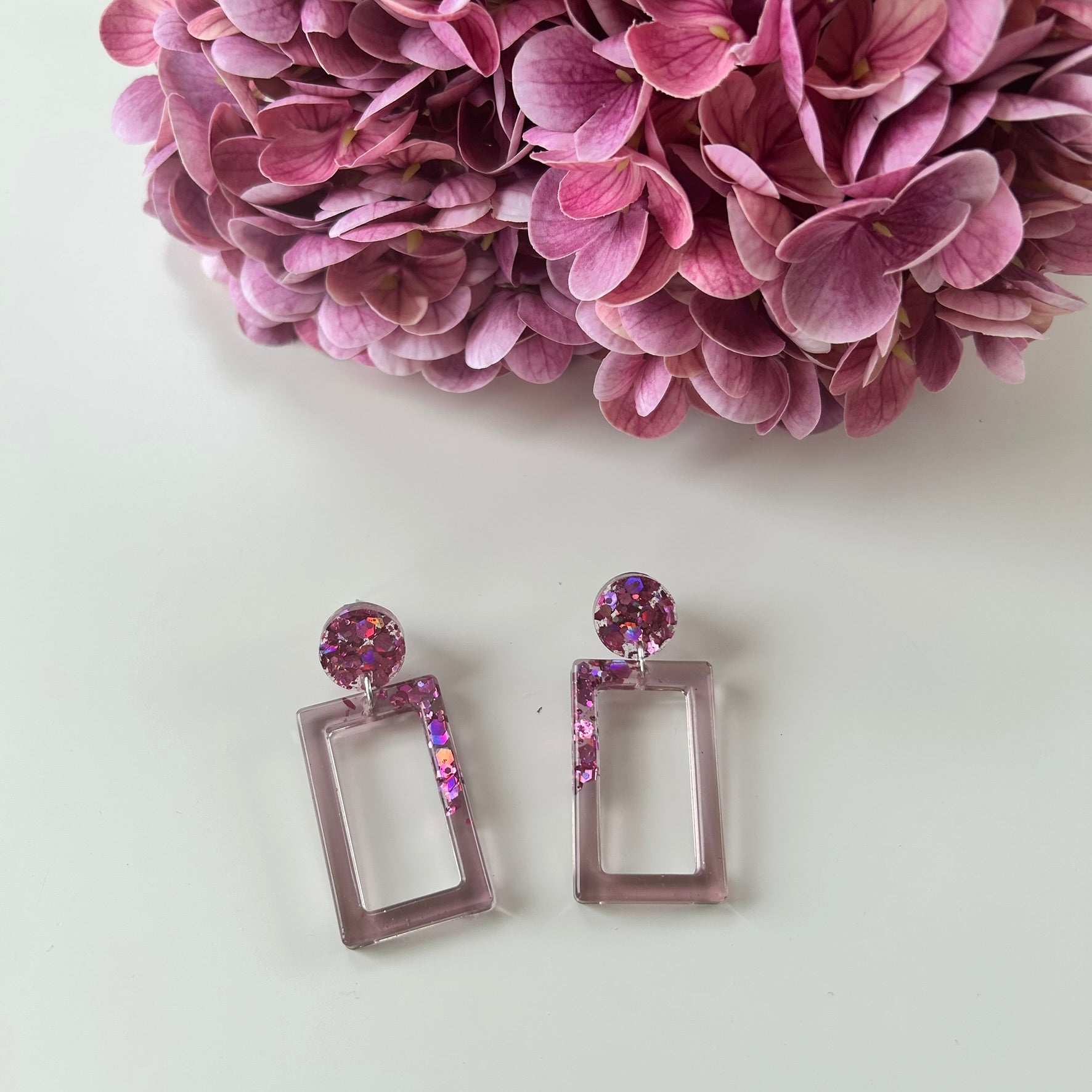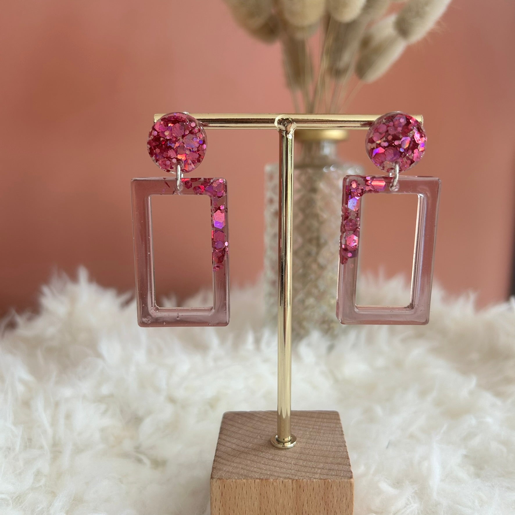 Chaque boucle associe un cercle scintillant aux reflets roses à un rectangle ajouré en résine transparente légèrement teintée, pour un look lumineux et sophistiqué.