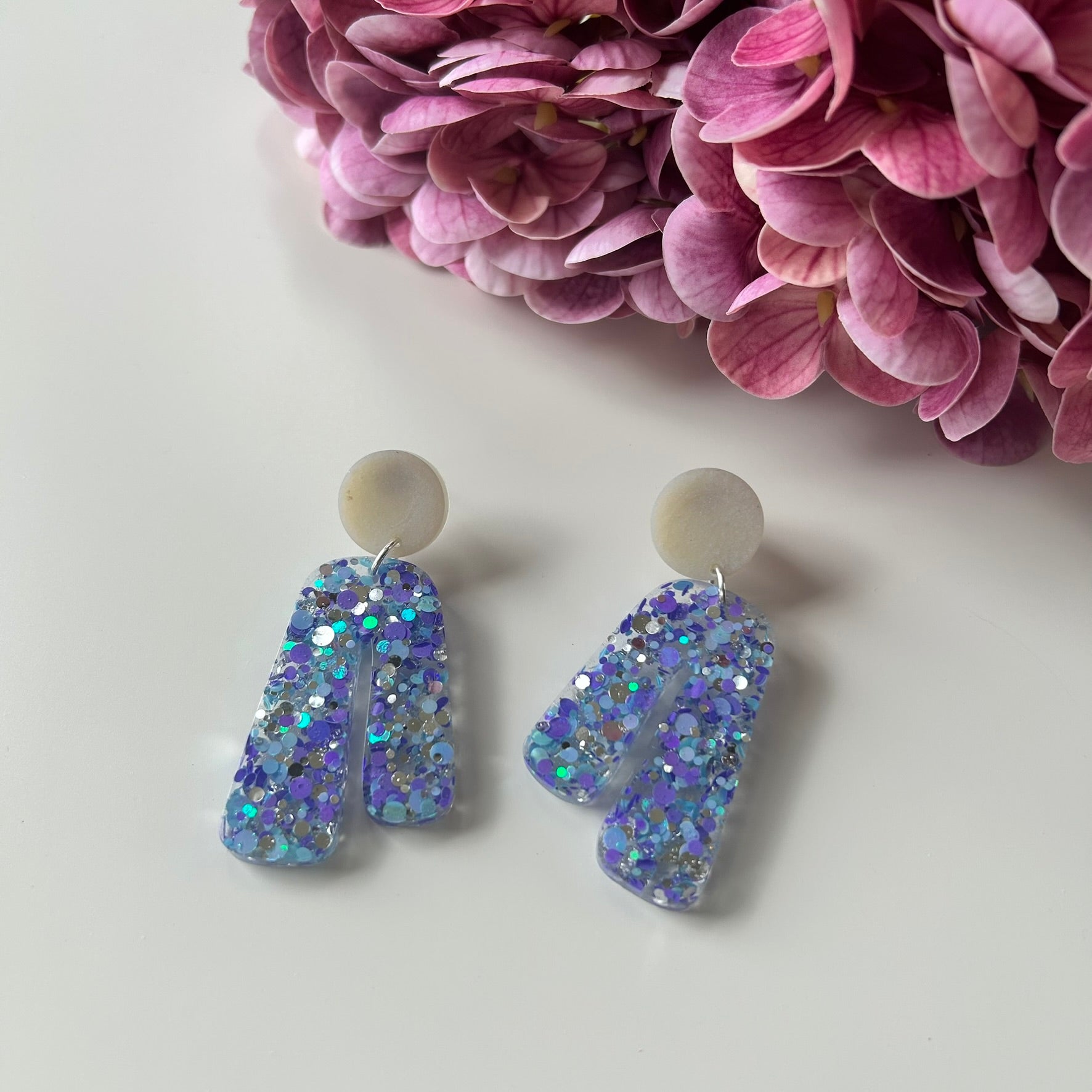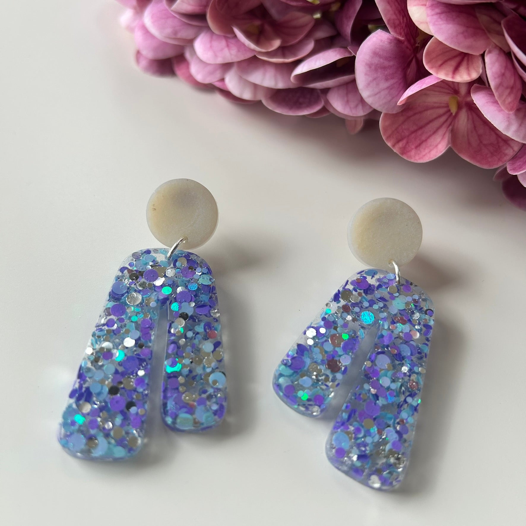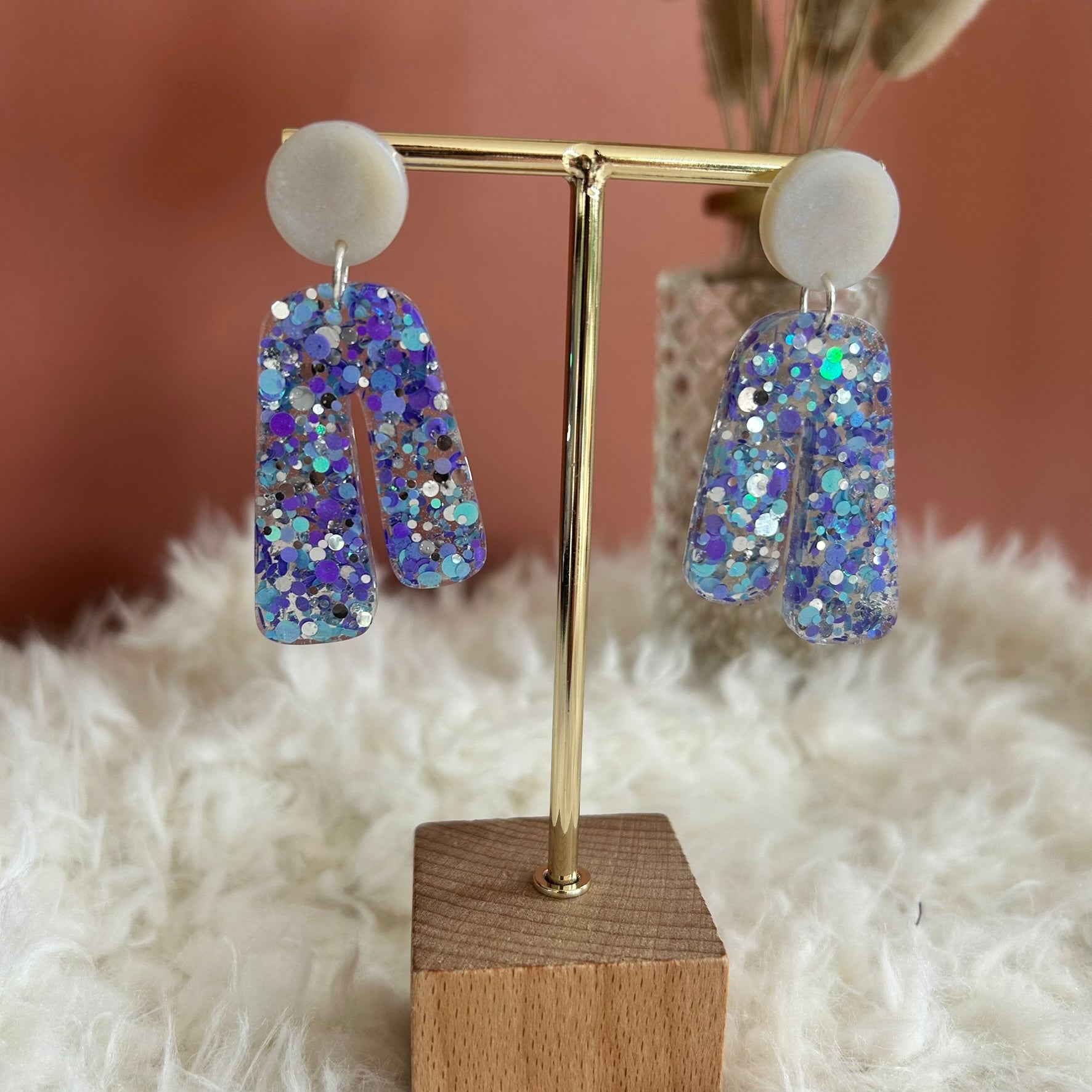 💜 Lumineuses et festives, ces boucles d'oreilles se parent d'éclats violets, argentés et bleus incrustés dans la résine. Leur forme graphique en double branche apporte une touche moderne et originale, parfaite pour celles qui aiment se démarquer.
