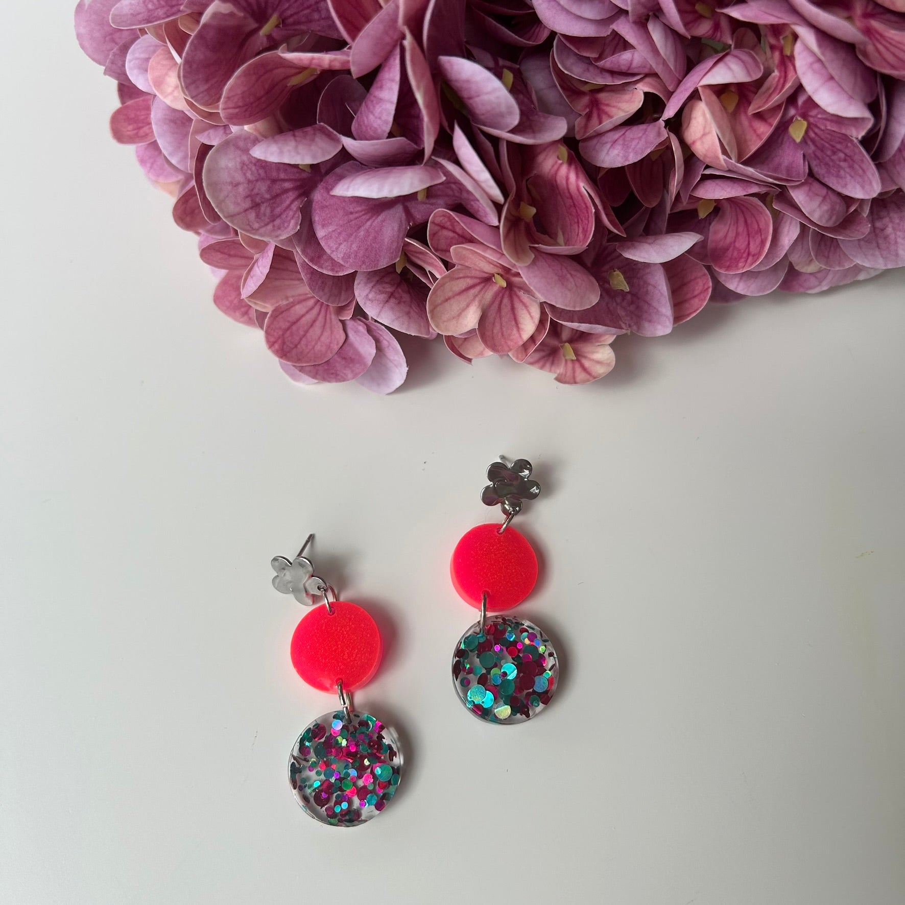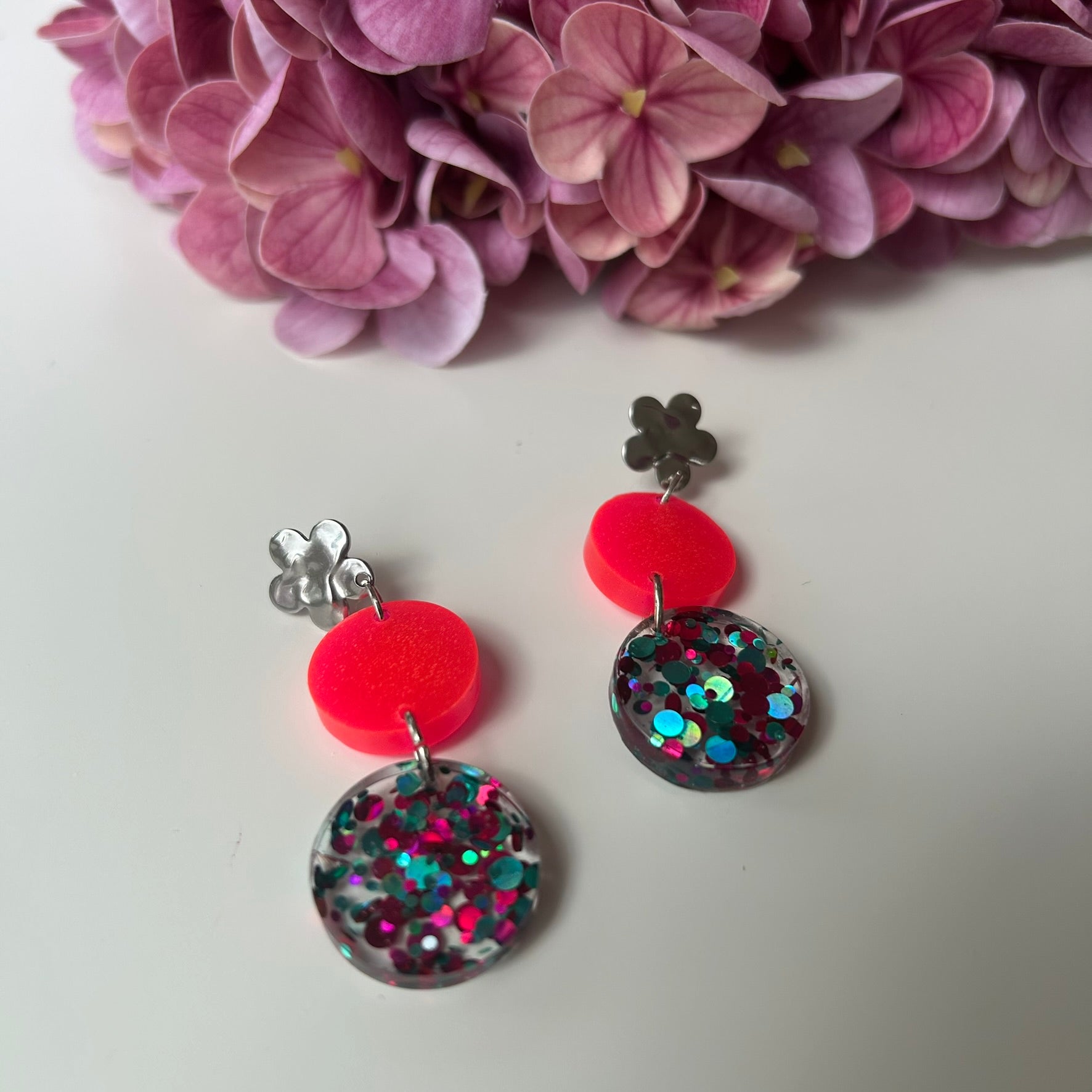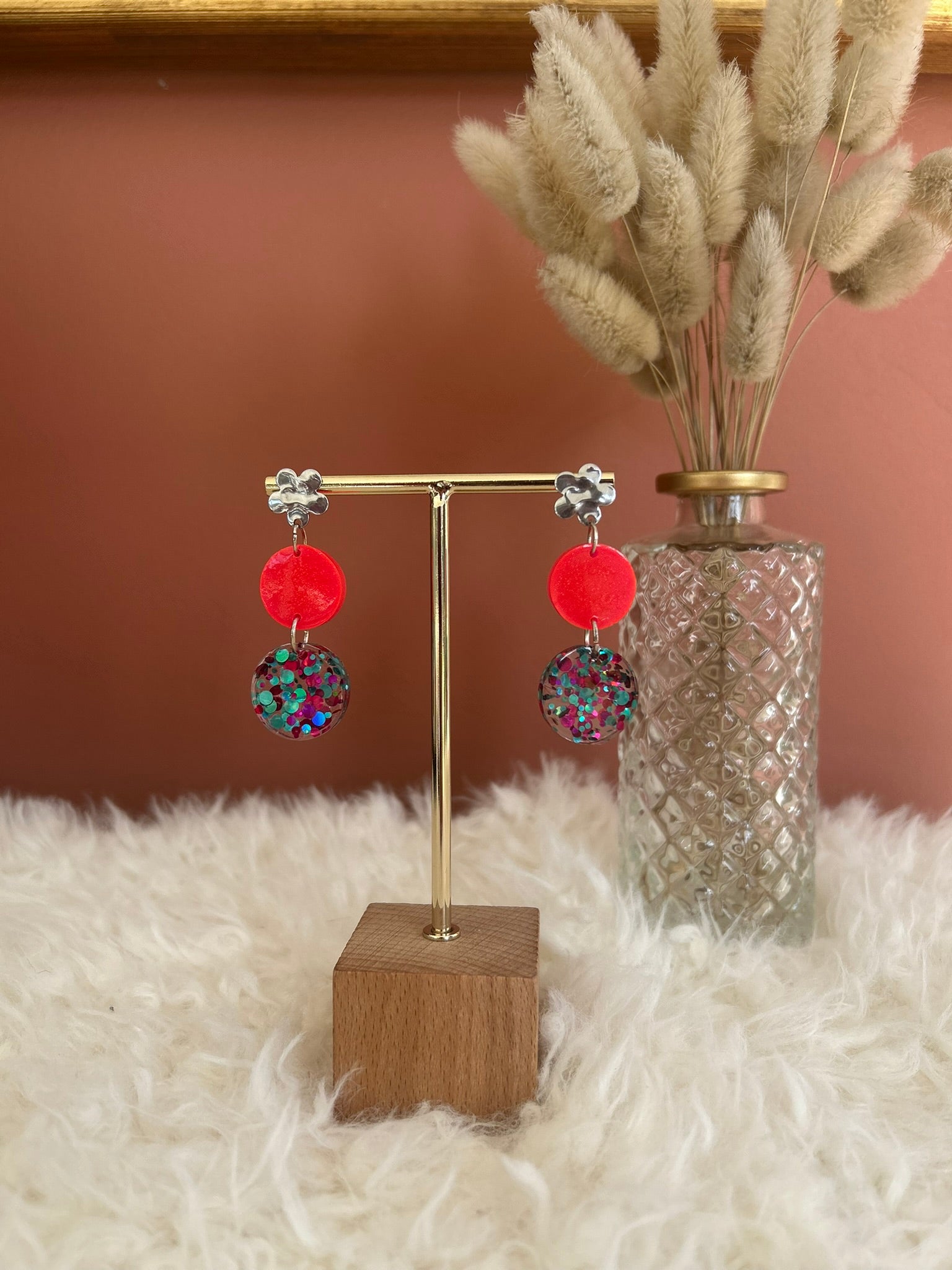 Chaque pièce associe un cercle rose fluo et un médaillon scintillant aux paillettes bleues turquoise et rose, pour un rendu à la fois moderne, joyeux et élégant.