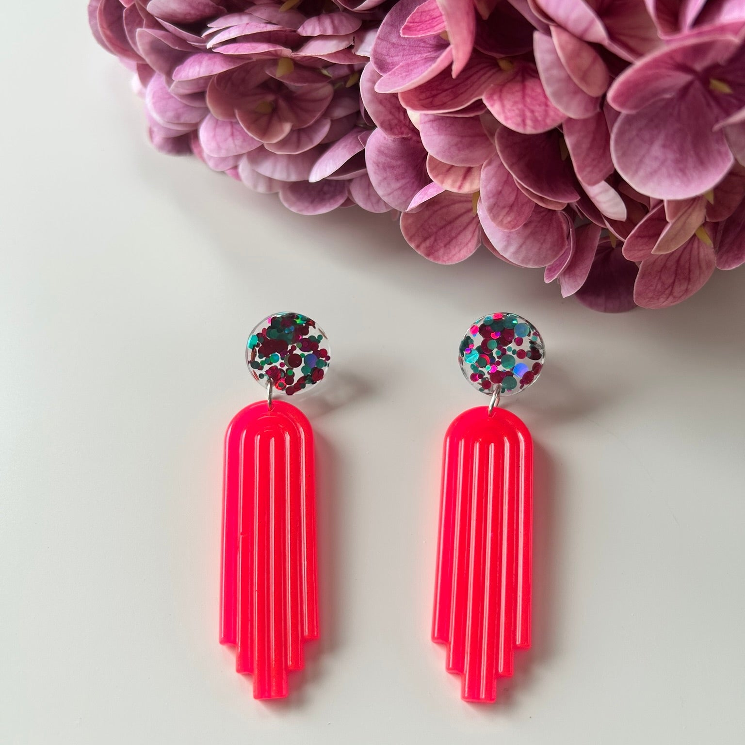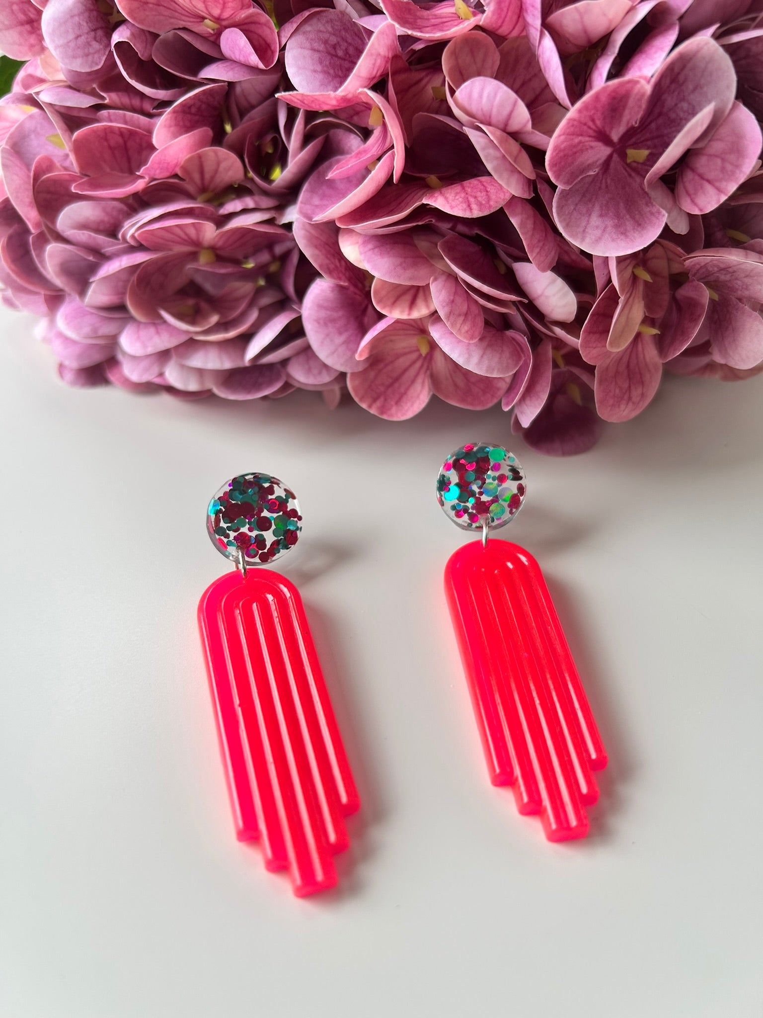 Leur pastille scintillante multicolore contraste avec une longue pièce géométrique en résine rose néon, apportant éclat, originalité et énergie à vos tenues.