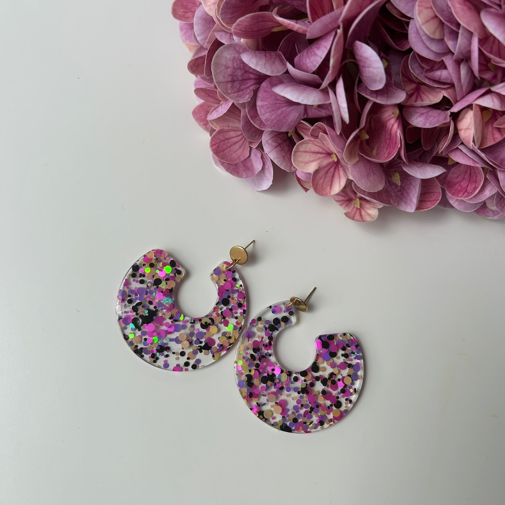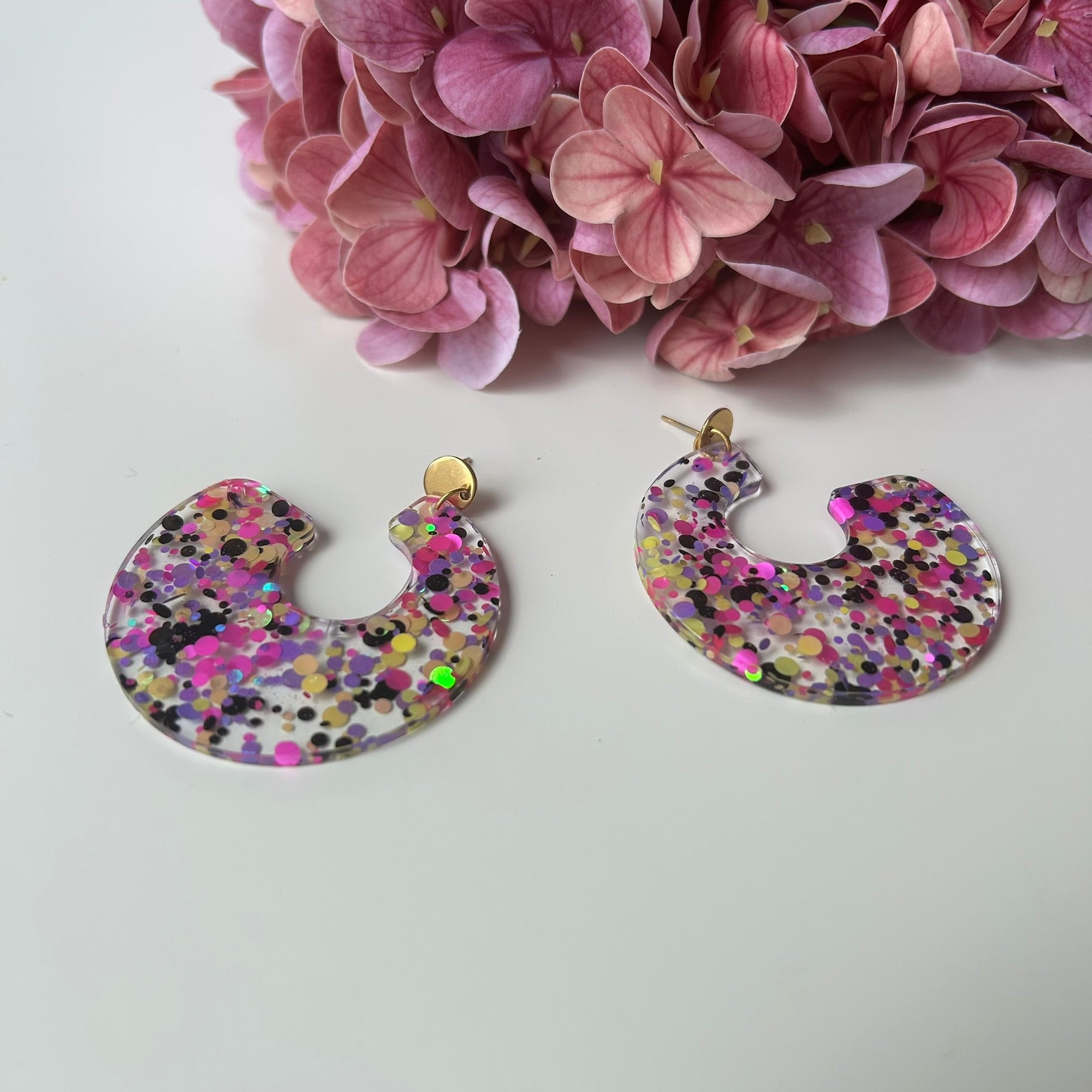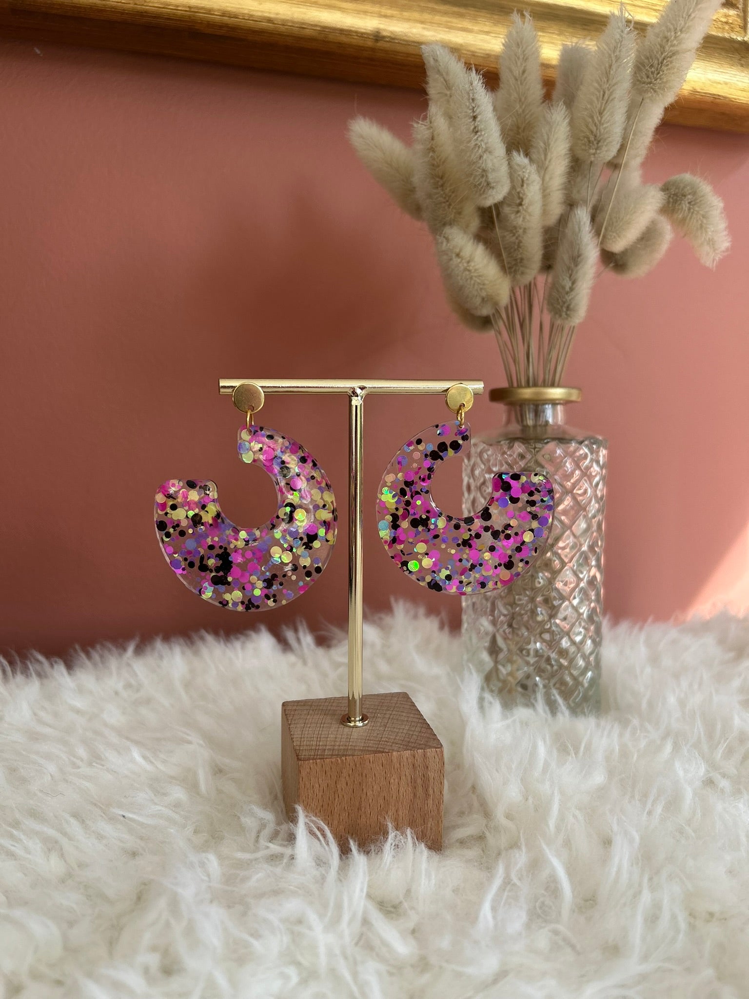 Elles sont réalisées en résine transparente incrustée de paillettes multicolores aux reflets irisés, pour un effet lumineux à chaque mouvement.